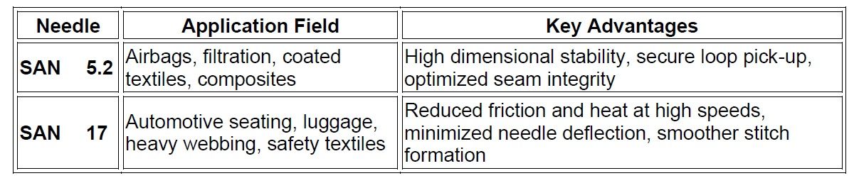 The Sewing Division will spotlight two specialized SAN (Special Application Needles) designed for technical textile processing: